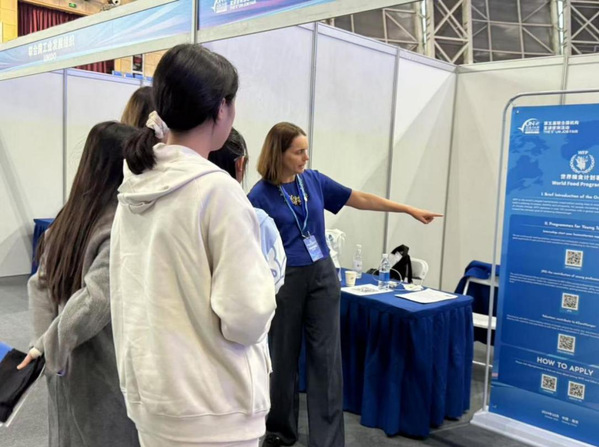 活动现场,多个联合国机构设立了展位,展示了各自的使命和项目,包括联合国开发计划署、世界卫生组织和联合国儿童基金会等。同学们在咨询环节中踊跃向展位代表咨询,了解联合国机构的工作内容及志愿者机会,并就申请志愿者职位、联合国工作环境及职业发展等议题进行了深入讨论。