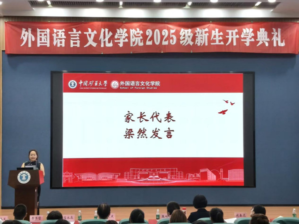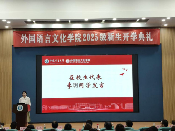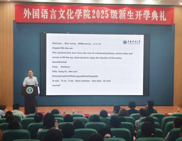 开学典礼之后,祖大庆为2025级新生讲授开学第一课。他首先回顾了学院自成立以来的发展历程与办学传统,介绍了学院在外语人才培养、学科建设与国际交流方面取得的显著成就。之后他从专业布局、课程设置与教学资源等方面,系统阐述了英语、德语专业的特色与优势,强调学院始终坚持“厚基础、宽口径、重实践”的育人理念,构建兼具人文底蕴与时代气息的课程体系。最后,他希望同学们珍惜时光,不负韶华,在大学里全方位锻炼,不断提升个人素养,努力成为优秀的外语人才和祖国的栋梁之材。