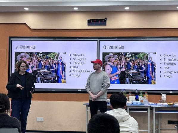 活动伊始,电子游艺 副院长、澳研中心主任翟石磊致开幕辞。他代表学院向远道而来的澳大利亚师生表示热烈欢迎,并指出语言与文化是连接世界的桥梁,是促进民心相通的重要力量。格里菲斯大学人文学院胡明雁老师在随后的致辞中,以幽默风趣的语言分享了自己的跨文化经历,鼓励两国青年积极学习彼此语言,深入了解多元文化,在交流中拓展视野、增进理解。