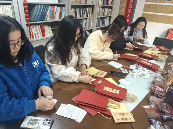 12月8日,学院组织学生集中撰写祝福贺卡并分装考研助力包。礼包内含寓意 “好事发生” 的花生、 “纸定上岸” 的手帕纸、 “未来可期” 的红色金属书签等。此外,礼包中还附有学院师生亲笔书写的明信片,字里行间满是师长的叮咛与学弟学妹的期盼。12月15日,毕业班辅导员闫瑾、李梦娇和学生党员一同走访宿舍,慰问同学考研情况,既肯定了备考学子的坚持与勇气,也送出了对他们的美好祝愿,让大家在冲刺阶段切实感受到学院的陪伴与支持。