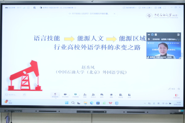 赵秀凤以“语言技能—能源人文—能源区域行业高校外语学科的求变之路”为题作主旨发言,以“启发:共生”为起点,导出“思考:对接”核心思路,启示能源高校人文学科体系建设;在“行动:生存”中具体介绍“一体两翼、三化赋能”全球胜任力人才培养模式;在“收获:发展”部分分享人才培养成果;在“规划:超越”部分展望特色研究方向。